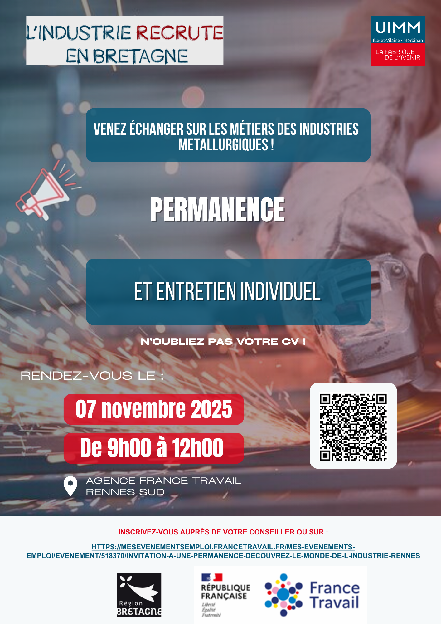 07/11/2025 – Permanence France Travail Rennes-Sud + Ajouter à mon Agenda Google + Exporter vers iCal Date 07 Nov 2025 Expiré! Heure 9 h 00 min - 12 h 00 min Lieu POLE EMPLOI RENNES SUD 2 bis avenue des Pays Bas - RENNES Partagez cet événement