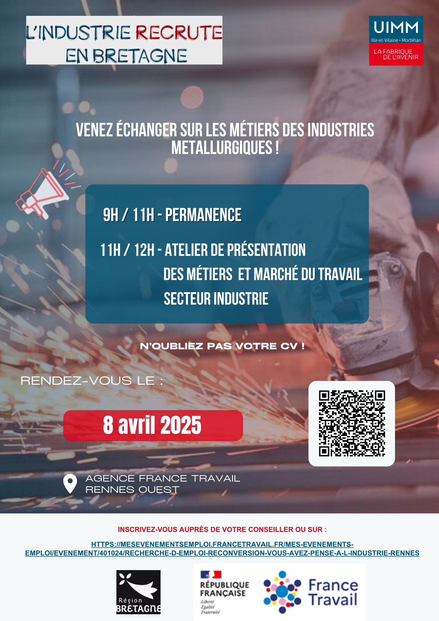 08/04/2025 – Permanence et Atelier de présentation des métiers et marché du travail secteur Industrie France Travail Rennes Ouest + Ajouter à mon Agenda Google + Exporter vers iCal Date 08 Avr 2025 Expiré! Heure 9 h 00 min - 12 h 00 min Lieu POLE EMPLOI RENNES OUEST 167 route de Lorient - RENNES Partagez cet événement