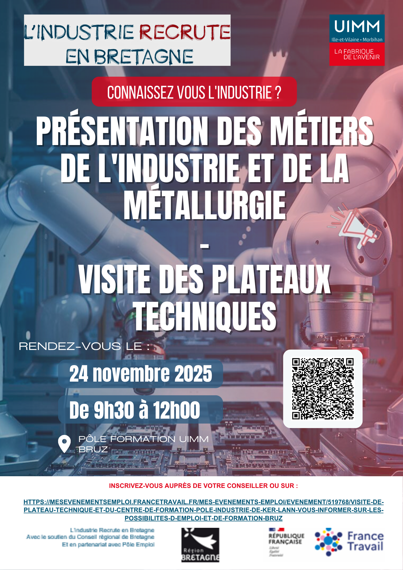 24/11/2025 – Atelier de présentation des métiers suivi d’une visite des plateaux techniques à Bruz + Ajouter à mon Agenda Google + Exporter vers iCal Date 24 Nov 2025 Heure 9 h 30 min - 12 h 00 min Lieu Pole Formation UIMM Bruz Rue Henri Moissan - Campus Ker Lann - BRUZ Partagez cet événement